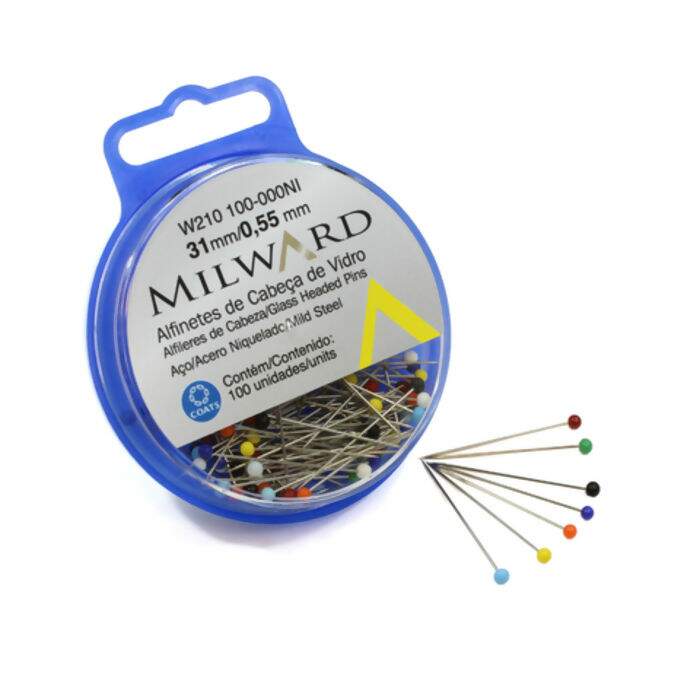 Alfinete simples de aço niquelado, com cabeça de vidro colorido, corpo super fino que evita danos à trama do tecido.