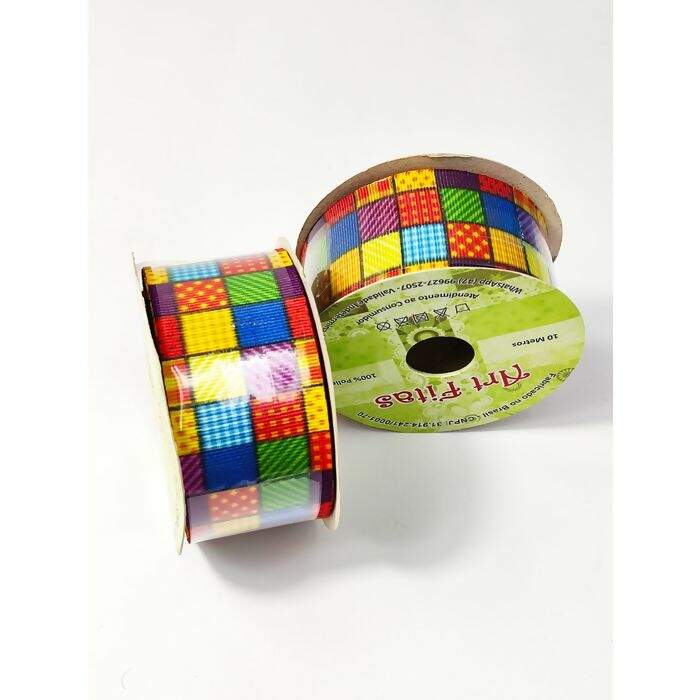 Descrição Fita de Gorgurão Art Fitas 38mm xadrez com bandeirolas colorida 10mts