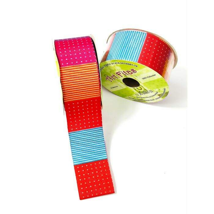 Fita de Gorgurão Art Fitas 38mm xadrez com bolinha rosa,azul,laranja e vermelha 10mts