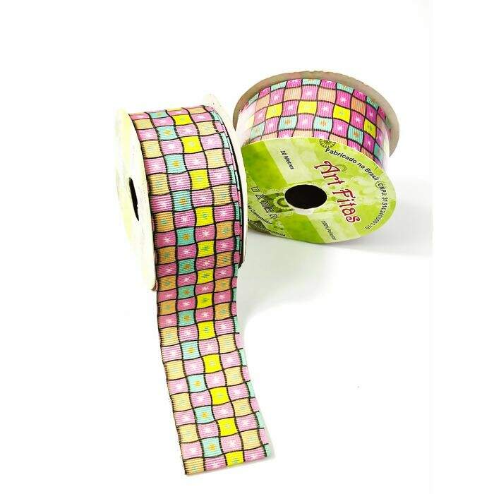 Fita de Gorgurão Art Fitas 38mm xadrez com quadrados colorido 10mts